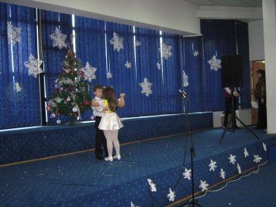 Fara a fi zapada dar cu dorinta mare de a ajunge sa se intalneasca, la Biblioteca Municipala “Radu Rosetti”, cu prietenii sai de la Centrul de Servicii Sociale “Alexandra” din Onesti, Mos Craciun a pornit, cu renii sai, aceasta calatorie, pregatind si o frumoasa poveste de iarna. Astfel, cand Craciunul se apropia cu pasi repezi, din palatul sau Mos Craciun impreuna cu spiridusii incarcau sacii cu daruri, pentru toti copiii. Aceasta calatorie a lui a inceput in atelierul ornamentelor de brad, unde se gaseau nenumarate globulete frumos stralucitoare. Despre aceste globulete se stie ca odata un mester sticlar lucra toata ziua sa poata hrani si avea grija de cei doi copii ai sai, o fetita si un baiat. Intr-o zi acestia s-au gandit sa ii faca tatalui o surpriza si au incercat ca sa faca si ei un vas… Oricat s-au straduit baiatul vasul nu a capatat forma pe care si-o dorea si a ramas asemeni unui balon mic de sticla. Povestea spune ca de teama sa nu isi supere tatal baiatul i-a pus o mica agatatoare balonului si i l-a daruit surorii sale, sa se joace cu el. Aceasta a pictat micul balon si cu o fundita l-a agatat intre crengile unui brad… iar de atunci toti oamenii au cumparat de la sticlar globulete iar ei nu au mai avut grija zilei de maine… Si astfel Mos Craciun a urmarit, in programul prezentat de copiii de la Centrul de Servicii Sociale “Alexandra” din Onesti “Dansul globuletelor”, pregatit impreuna cu educatoarele de la Terapie Educationala. In sala ornamentelor de brad, cum stateau frumos asezati in cutii clopotei de diferite marimi si culori, magia Craciunului a facut ca sa ajunga in poveste si “globuletele” de la Casa Maria, ce s-au prins intr-un dans vesel.