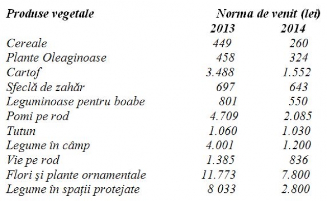 Stabilirea venitului anual din activitati agricole pe baza de norme de venitSi normele de venit „utilizate la impunerea veniturilor obtinute din cresterea si exploatarea animalelor / familiilor de albine” in 2014 sunt mai mici decat cele stabilite de Guvern in 2013. Pentru vaci si bivolite norma de venit stabilita de Directia Agricola e de 249 lei / cap de animal, pentru oi si capre e de 23 lei, pentru porci „la ingrasat” – 37 lei, pentru pasari de curte – 2 lei si pentru familiile de albine – 29 lei.