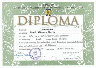 La Olimpiada Internationala de Limba, Comunicare si Literatura Romana “George Calinescu” de la Piatra Neamt, eleva Bianca Maria Marin (din clasa a X-a, la Colegiul Sportiv “Nadia Comaneci” din Onesti) a obtinut premiul I cu un punctaj maxim de 120 de puncte la cele trei probe ale acestui puternic concurs. Dupa cum a declarat prof. Luminita Georgeta Varlan, inspector scolar general al ISJ Neamt, “aceasta olimpiada a avut loc la granita dintre doua anotimpuri iar municipiul Piatra Neamt a devenit «Mecca» celor care vorbesc si simt romaneste la superlativ si «Capitala Limbii Romane». Aceasta competitie creeaza in fiecare an un areal aparte in care cei indragostiti de arta cuvantului, elevi si profesori, intra intr-o alta dimensiune a existentei. Avand cu totii o pasiune comuna cartile, lectura si scrisul, cel mai frumos gand ar fi cel al lui Borges care imagina Paradisul ca o imensa biblioteca”.